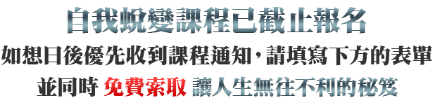 你可以放心留下你的E-mail,你的個人資料是被保護的,且絕對不會被分享、出租、出售或是被發送任何的垃圾郵件。當你註冊後,你將優先得知自我蛻變課程的發售時間以及讓你收到關於心靈、情緒這方面的最新消息,當然,如果你日後覺得不須要了,可以隨時退訂電子報。